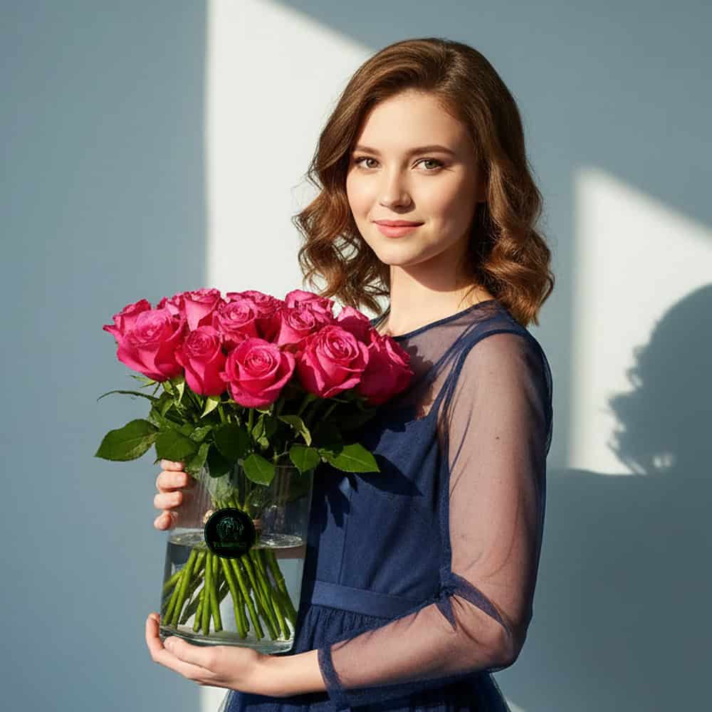 A Vase arrangement with 20 Dark Pink roses arranged in a Clear Glass Vase.