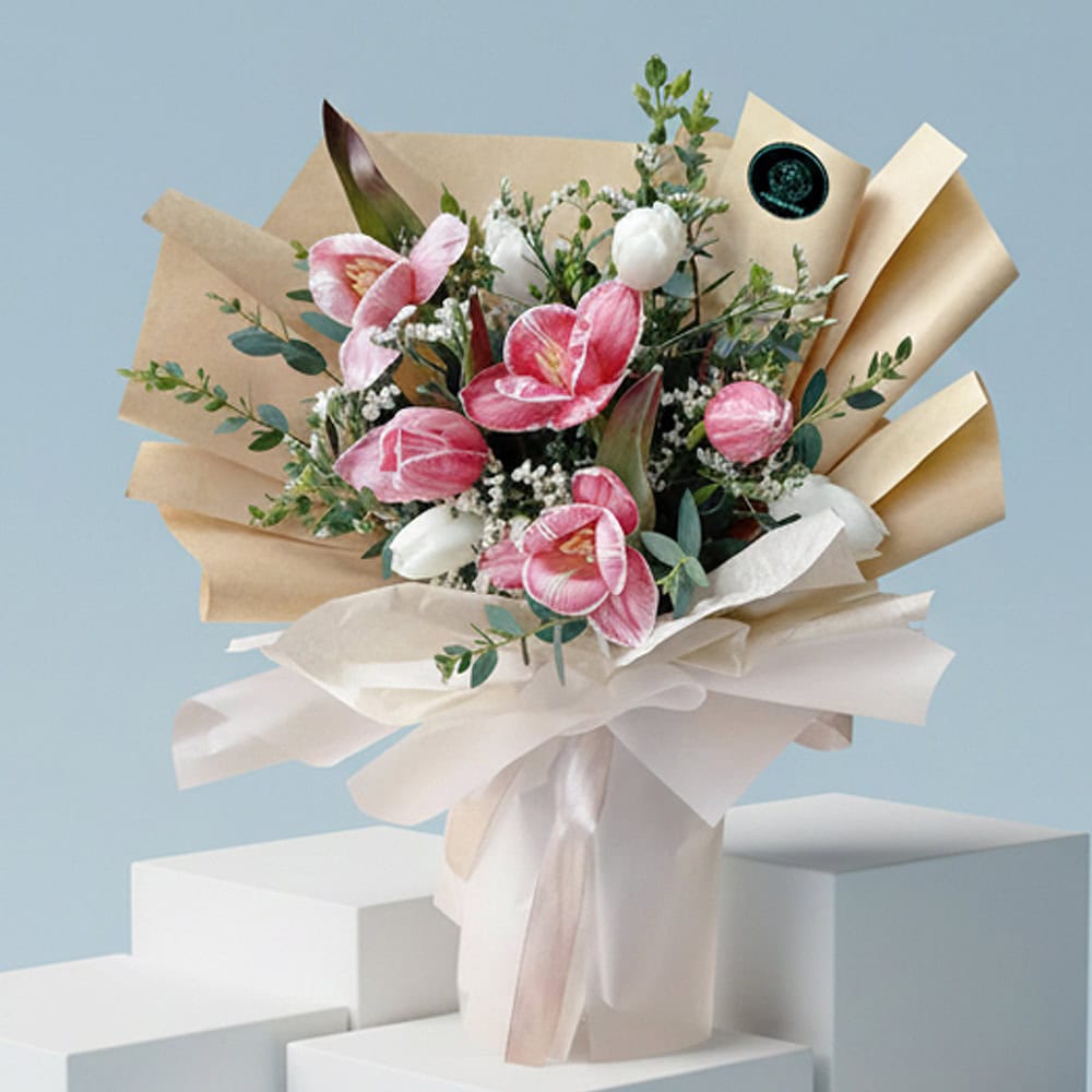 • At Tumshoo – Dubai’s trusted fresh flower shop, we use the freshest premium flowers in every arrangement. However, some fillers, foliage, or flower colors may be seasonal or subject to availability. In such cases, our expert florists in Dubai will hand-select the best available alternatives to beautifully complement your bouquet or floral arrangement while maintaining its original design and elegance.
